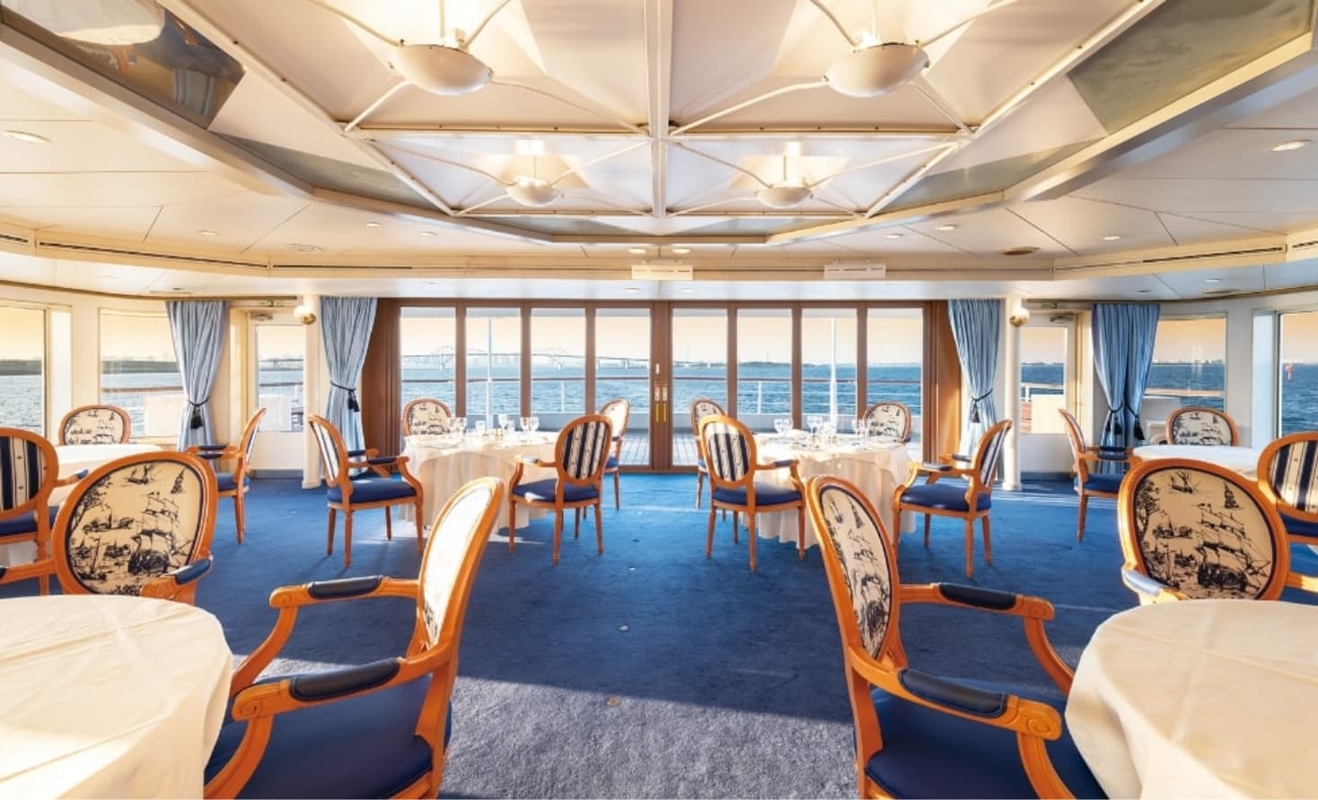 重厚なマホガニー材をふんだんに使った船室は、エグゼクティブのご会食、ご接待や結納にもご利用いただけます。