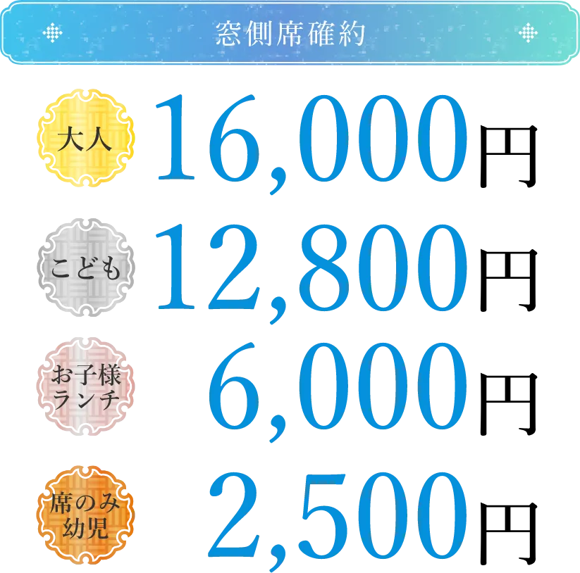 ※上記料金には、表記のお食事、サービス料、消費税のほか、乗船料が含まれております。